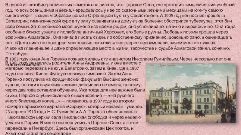 Слайд 7В одной из автобиографических заметок она писала, что Царское Село, где
