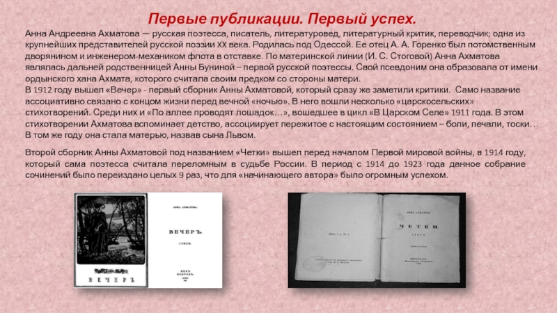 Её первое стихотворение появилось в 1911 году. За год до этого она обвенчалась с известным поэтом-акмеистом Н. С. Гумилевым. В 1912 году у писательской четы появился на свет сын – Лев. В этом же году вышел в свет её первый сборник стихов под названием «Вечер». Следующий сборник «Чётки» появился в 1914 году и был распродан внушительным тиражом. Основные черты творчества поэтессы сочетали отличное понимание психологии чувств и личные переживания по поводу общенародных трагедий XX века.