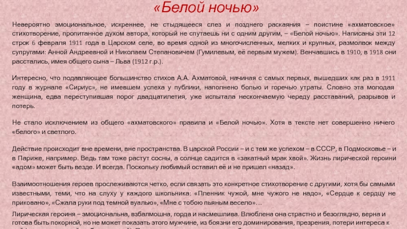 – поистине «ахматовское» стихотворение, пропитанное духом автора, который не спутаешь ни с одним другим, – «Белой ночью». Написаны эти 12 строк 6 февраля 1911 года в Царском селе, во время одной из многочисленных, мелких и крупных, размолвок между супругами: Анной Андреевной и Николаем Степановичем (Гумилевым, её первым мужем). Венчавшись в 1910, в 1918 они расстались, имея общего сына – Льва (1912 г.р.).