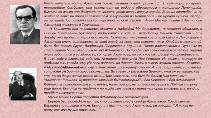В Ташкенте она поселилась вместе с Надеждой Мандельштам, постоянно общалась с Лидией Корнеевной Чуковской, подружилась с жившей неподалеку Фаиной Раневской – эту дружбу они пронесли через всю жизнь. Почти все ташкентские стихи были о Ленинграде – Ахматова очень волновалась за свой город, за всех, кто остался там. Особенно тяжело ей было без своего друга, Владимира Георгиевича Гаршина. После расставания с Пуниным он стал играть большую роль в жизни Ахматовой. По профессии врач-патологоанатом, Гаршин очень заботился о ее здоровье, которым Ахматова, по его словам, преступно пренебрегала.