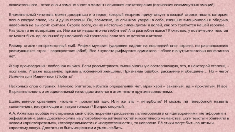 А.А. Ахматова вообще не старалась свои стихотворения «расцветить» аллегориями и олицетворениями, метафорами и эвфемизмами. Была довольно скупа на употребление витиеватостей и кокетливого жеманства. Если тексты и обвиняли в некоем «аристократизме», «старорежимности» и «искусственности», то напрасно. Её стихи могут быть понятны и «простому люду». Достаточно быть искренним и уметь любить.