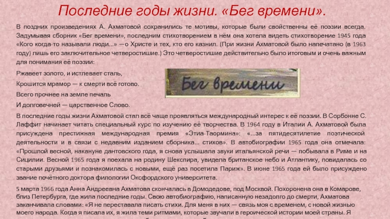 мотивы, которые были свойственны её поэзии всегда. Задумывая сборник «Бег времени», последним стихотворением в нём она хотела видеть стихотворение 1945 года «Кого когда-то называли люди...» —о Христе и тех, кто его казнил. (При жизни Ахматовой было напечатано (в 1963 году) лишь его заключительное четверостишие.) Это четверостишие действительно было итоговым и очень важным для понимания её поэзии: