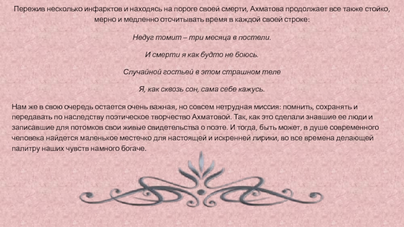 Слайд 32Пережив несколько инфарктов и находясь на пороге своей смерти, Ахматова продолжает