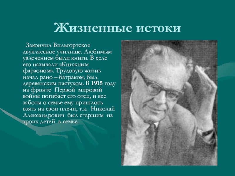 селе его называли «Книжным фараоном». Трудовую жизнь начал рано – батраком, был деревенским пастухом. В 1915 году на фронте Первой мировой войны погибает его отец, и все заботы о семье ему пришлось взять на свои плечи, т.к. Николай Александрович был старшим из троих детей в семье.
