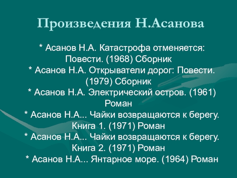 Слайд 24Произведения Н.А.Асанова