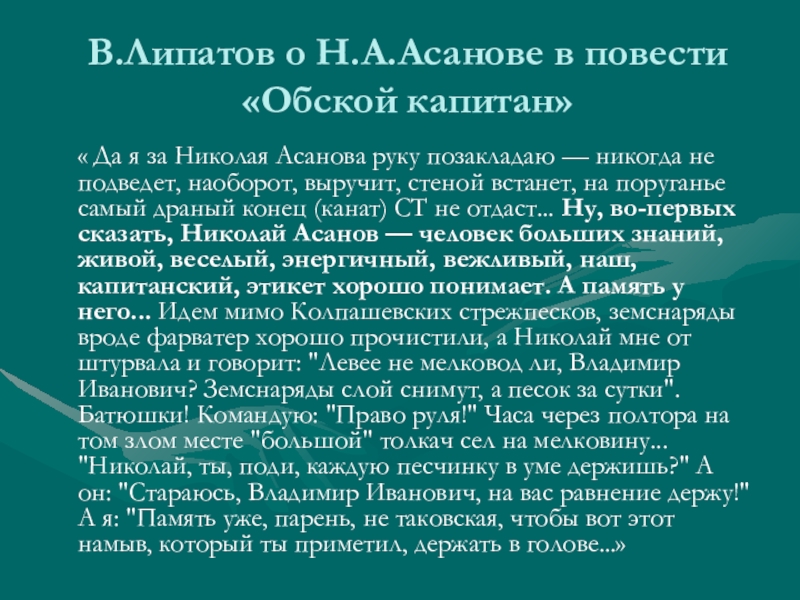 Слайд 27В.Липатов о Н.А.Асанове в повести «Обской капитан»