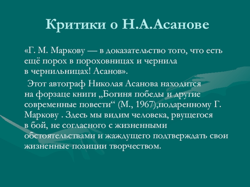 Этот автограф Николая Асанова находится на форзаце книги „Богиня победы и другие современные повести“ (М., 1967),подаренному Г.Маркову . Здесь мы видим человека, рвущегося в бой, не согласного с жизненными обстоятельствами и жаждущего подтверждать свои жизненные позиции творчеством.