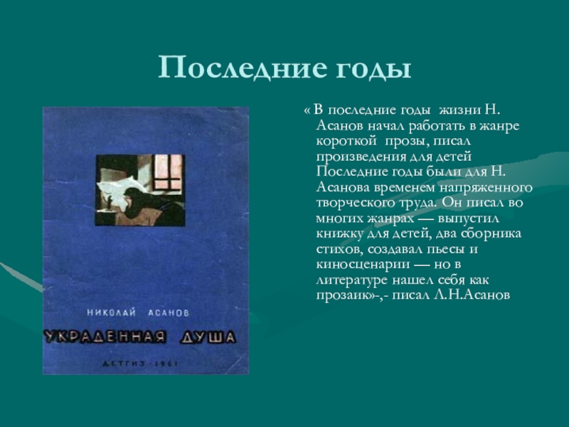 в жанре короткой прозы, писал произведения для детей Последние годы были для Н. Асанова временем напряженного творческого труда. Он писал во многих жанрах — выпустил книжку для детей, два сборника стихов, создавал пьесы и киносценарии — но в литературе нашел себя как прозаик»-,- писал Л.Н.Асанов