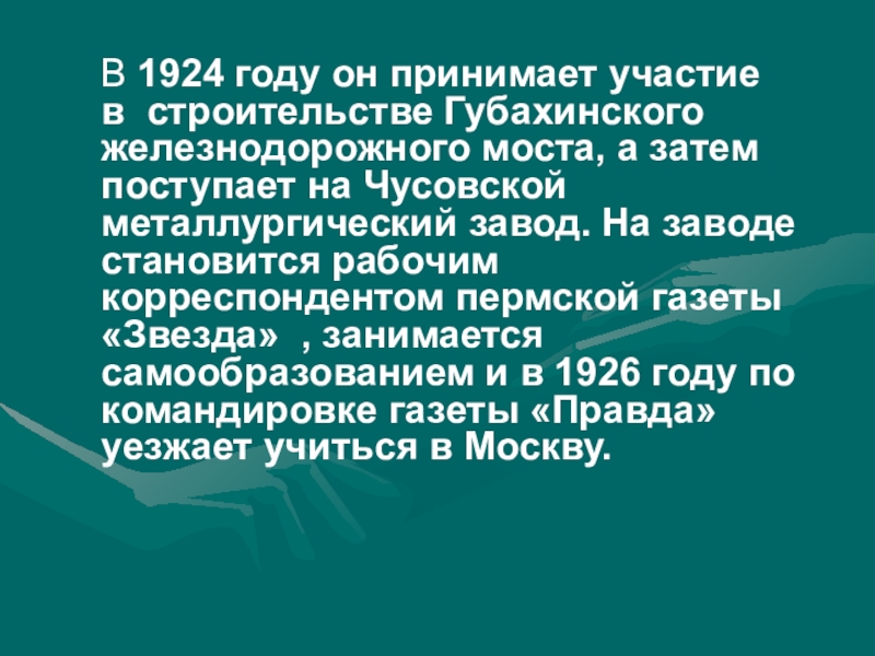 моста, а затем поступает на Чусовской металлургический завод. На заводе становится рабочим корреспондентом пермской газеты «Звезда» , занимается самообразованием и в 1926 году по командировке газеты «Правда» уезжает учиться в Москву.