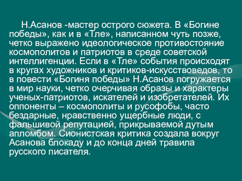 написанном чуть позже, четко выражено идеологическое противостояние космополитов и патриотов в среде советской интеллигенции. Если в «Тле» события происходят в кругах художников и критиков-искусствоведов, то в повести «Богиня победы» Н.Асанов погружается в мир науки, четко очерчивая образы и характеры ученых-патриотов, искателей и изобретателей. Их оппоненты – космополиты и русофобы, часто бездарные, нравственно ущербные люди, с фальшивой репутацией, прикрываемой дутым апломбом. Сионистская критика создала вокруг Асанова блокаду и до конца дней травила русского писателя.