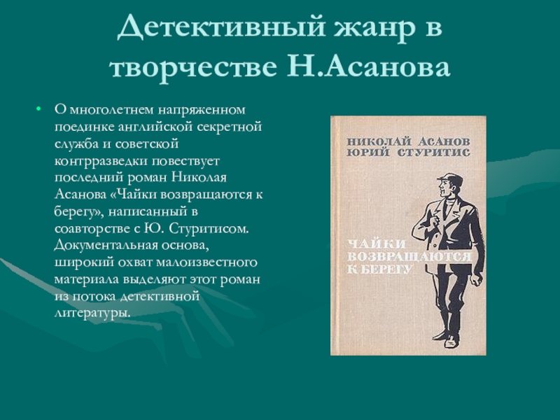 и советской контрразведки повествует последний роман Николая Асанова «Чайки возвращаются к берегу», написанный в соавторстве с Ю. Стуритисом. Документальная основа, широкий охват малоизвестного материала выделяют этот роман из потока детективной литературы.