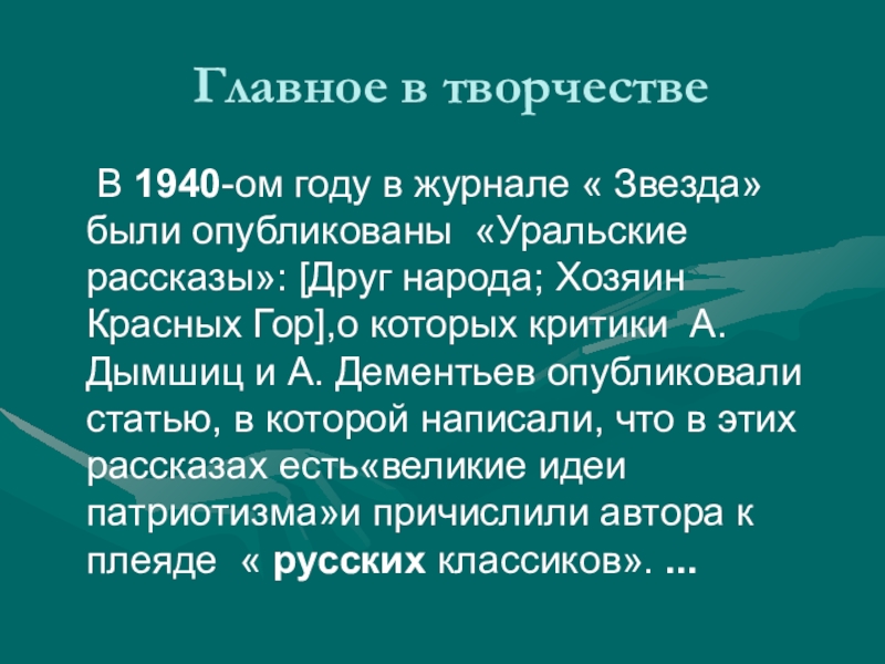 «Уральские рассказы»: [Друг народа; Хозяин Красных Гор],о которых критики А. Дымшиц и А. Дементьев опубликовали статью, в которой написали, что в этих рассказах есть«великие идеи патриотизма»и причислили автора к плеяде « русских классиков». ...