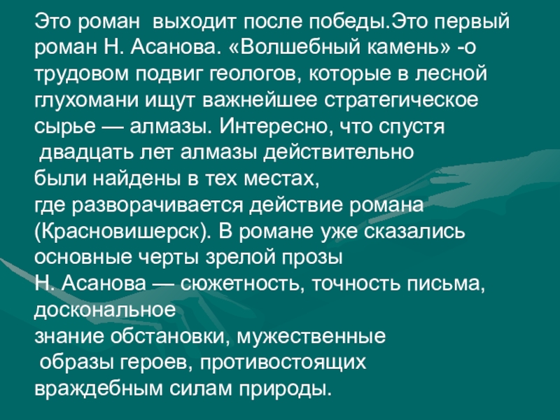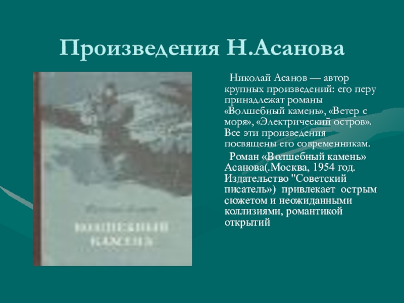 Роман «Волшебный камень» Асанова(.Москва, 1954 год. Издательство "Советский писатель») привлекает острым сюжетом и неожиданными коллизиями, романтикой открытий