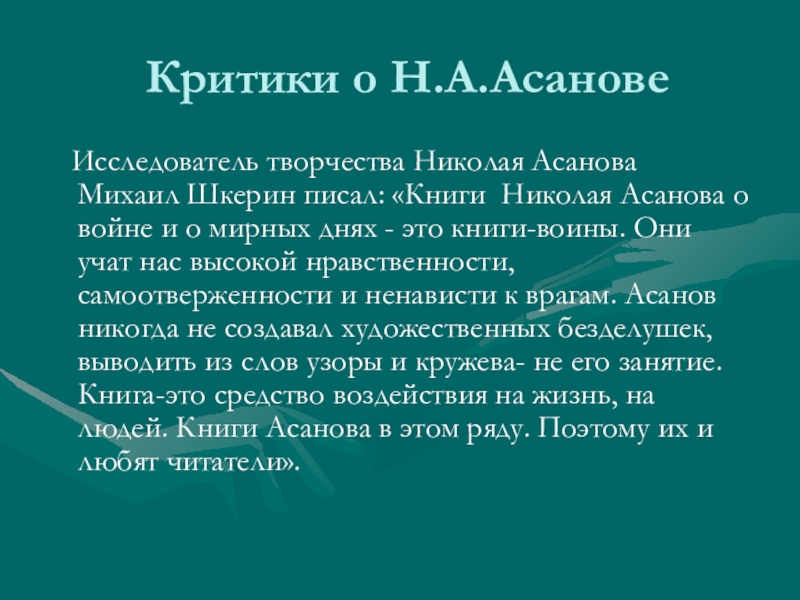 «Книги Николая Асанова о войне и о мирных днях - это книги-воины. Они учат нас высокой нравственности, самоотверженности и ненависти к врагам. Асанов никогда не создавал художественных безделушек, выводить из слов узоры и кружева- не его занятие. Книга-это средство воздействия на жизнь, на людей. Книги Асанова в этом ряду. Поэтому их и любят читатели».