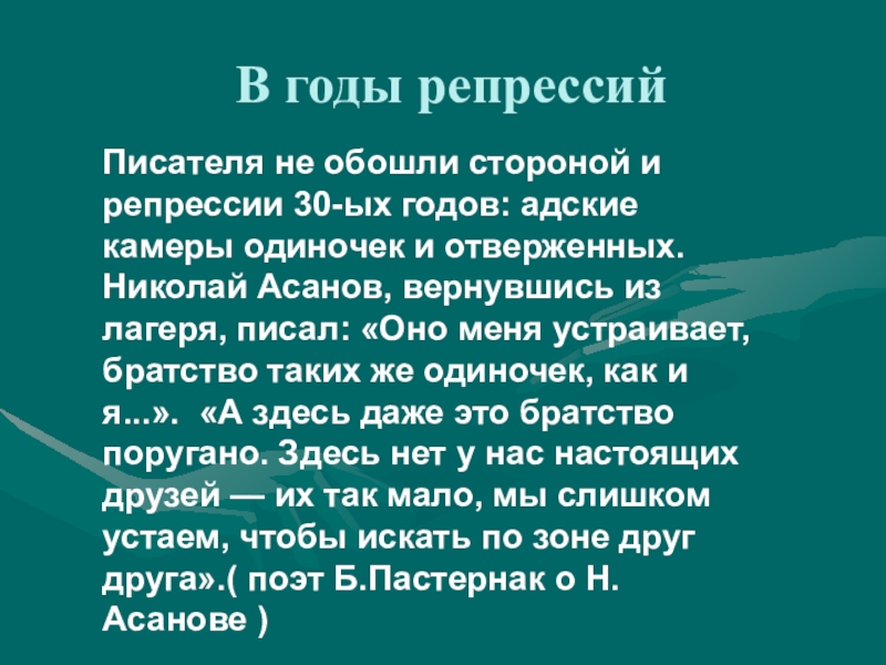 Николай Асанов, вернувшись из лагеря, писал: «Оно меня устраивает, братство таких же одиночек, как и я...». «А здесь даже это братство поругано. Здесь нет у нас настоящих друзей — их так мало, мы слишком устаем, чтобы искать по зоне друг друга».( поэт Б.Пастернак о Н.Асанове )