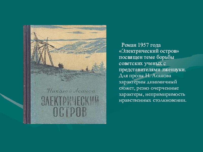 Слайд 13 Роман 1957 года «Электрический остров» посвящен теме борьбы советских ученых с