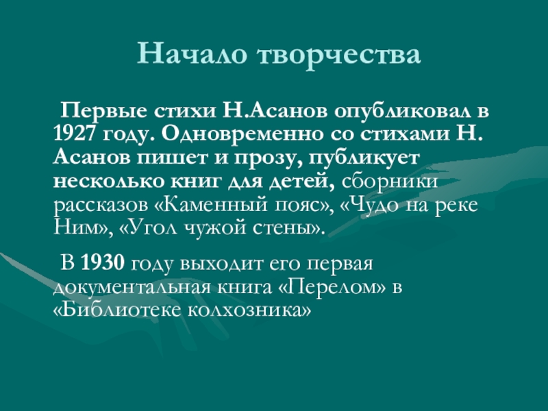 Первые стихи Н.Асанов опубликовал в 1927 году. Одновременно со