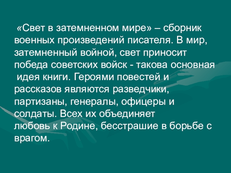 Слайд 17 «Свет в затемненном мире» – сборник военных произведений писателя. В
