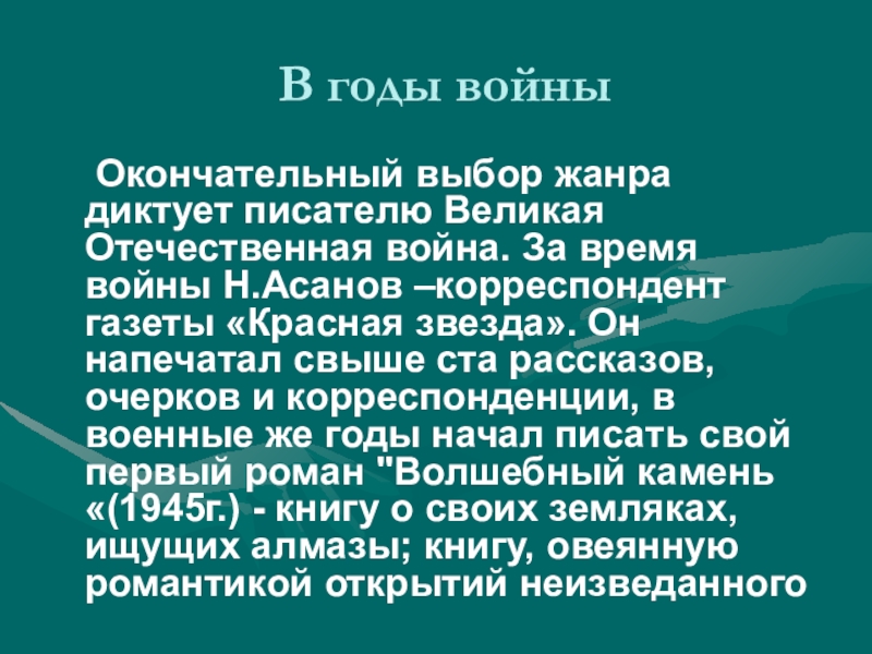 время войны Н.Асанов –корреспондент газеты «Красная звезда». Он напечатал свыше ста рассказов, очерков и корреспонденции, в военные же годы начал писать свой первый роман "Волшебный камень«(1945г.) - книгу о своих земляках, ищущих алмазы; книгу, овеянную романтикой открытий неизведанного