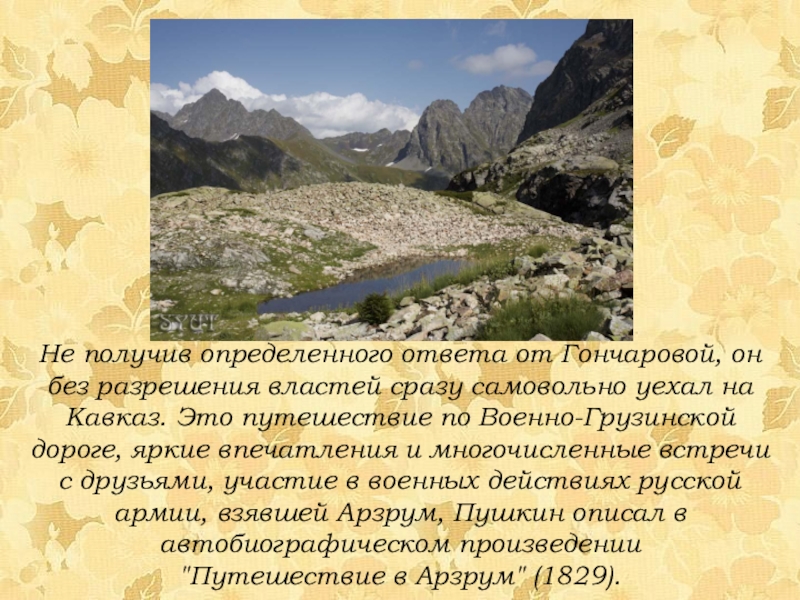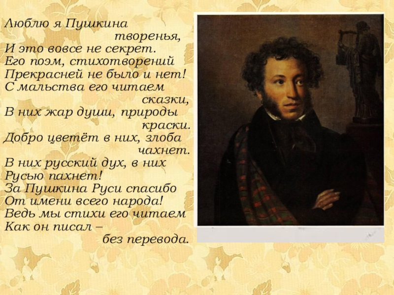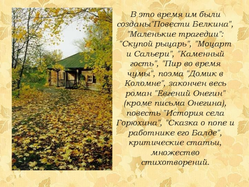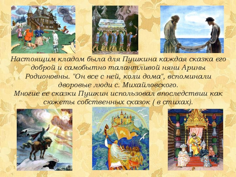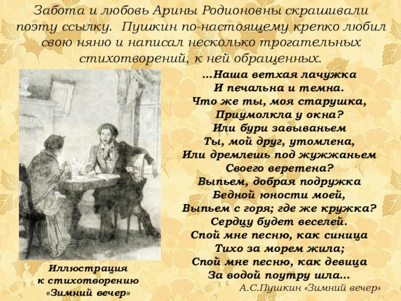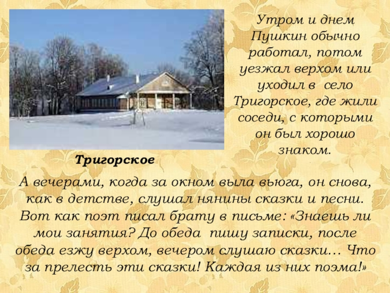 А вечерами, когда за окном выла вьюга, он снова, как в детстве, слушал нянины сказки и песни. Вот как поэт писал брату в письме: «Знаешь ли мои занятия? До обеда пишу записки, после обеда езжу верхом, вечером слушаю сказки… Что за прелесть эти сказки! Каждая из них поэма!»