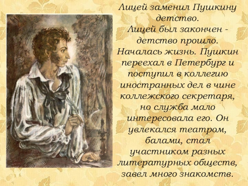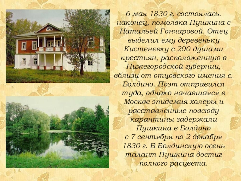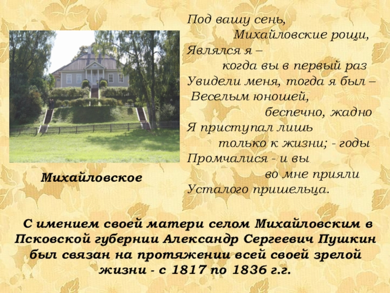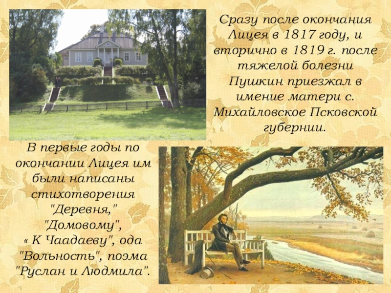 Сразу после окончания Лицея в 1817 году, и вторично в 1819 г. после тяжелой болезни Пушкин приезжал в имение матери с.Михайловское Псковской губернии.