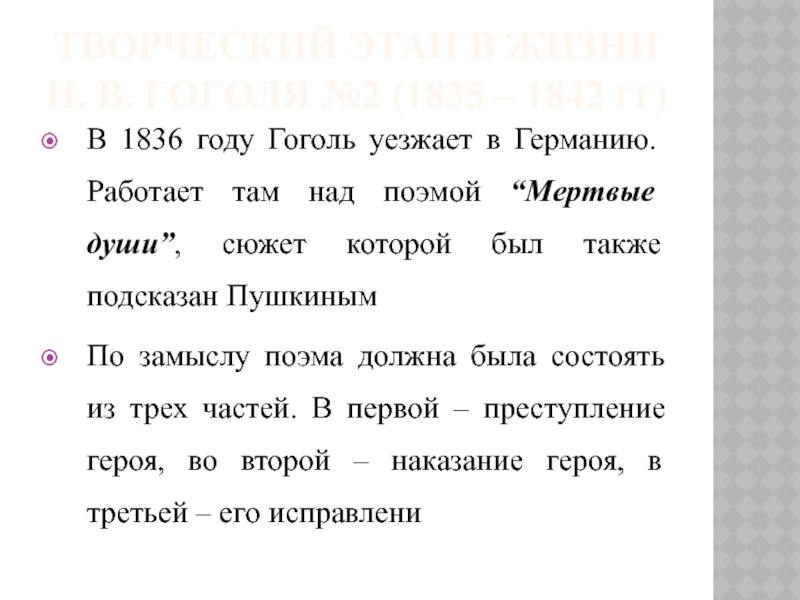В 1836 году Гоголь уезжает в Германию. Работает там над поэмой “Мертвые души”, сюжет которой был также подсказан Пушкиным