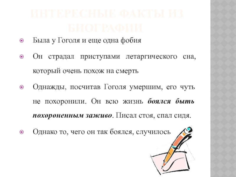 Однажды, посчитав Гоголя умершим, его чуть не похоронили. Он всю жизнь боялся быть похороненным заживо. Писал стоя, спал сидя.