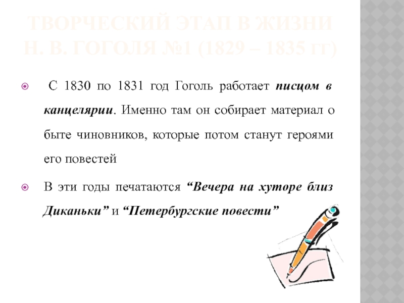 С 1830 по 1831 год Гоголь работает писцом в канцелярии. Именно там он собирает материал о быте чиновников, которые потом станут героями его повестей