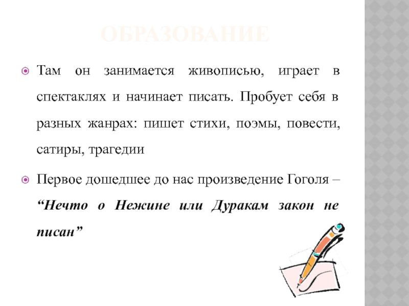 Первое дошедшее до нас произведение Гоголя – “Нечто о Нежине или Дуракам закон не писан”