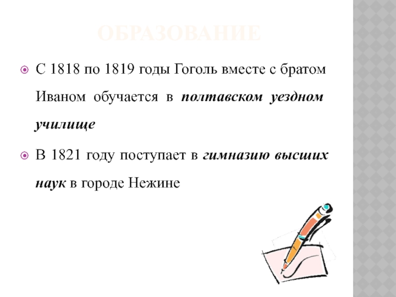 С 1818 по 1819 годы Гоголь вместе с братом Иваном
