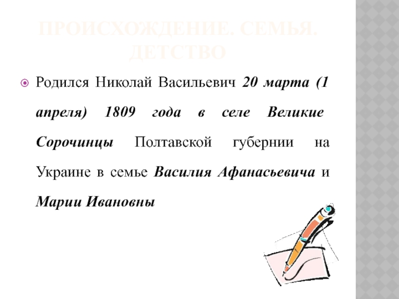 Родился Николай Васильевич 20 марта (1 апреля) 1809 года