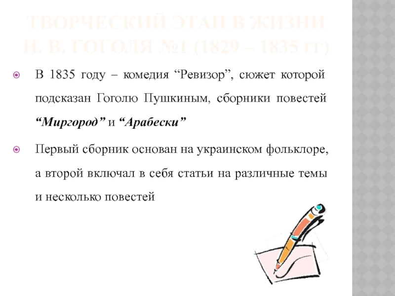 В 1835 году – комедия “Ревизор”, сюжет которой подсказан Гоголю Пушкиным, сборники повестей “Миргород” и “Арабески”