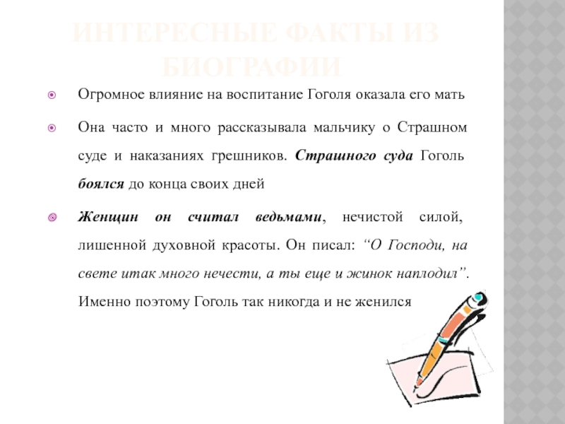 Женщин он считал ведьмами, нечистой силой, лишенной духовной красоты. Он писал: “О Господи, на свете итак много нечести, а ты еще и жинок наплодил”. Именно поэтому Гоголь так никогда и не женился