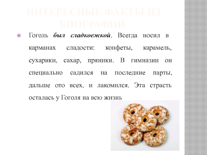 сладости: конфеты, карамель, сухарики, сахар, пряники. В гимназии он специально садился на последние парты, дальше ото всех, и лакомился. Эта страсть осталась у Гоголя на всю жизнь
