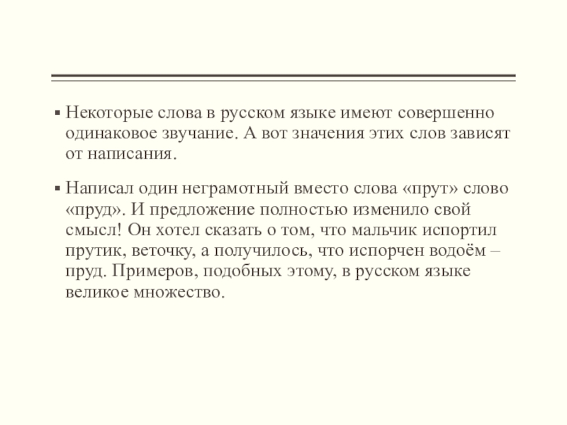 Написал один неграмотный вместо слова «прут» слово «пруд». И предложение полностью изменило свой смысл! Он хотел сказать о том, что мальчик испортил прутик, веточку, а получилось, что испорчен водоём – пруд. Примеров, подобных этому, в русском языке великое множество.