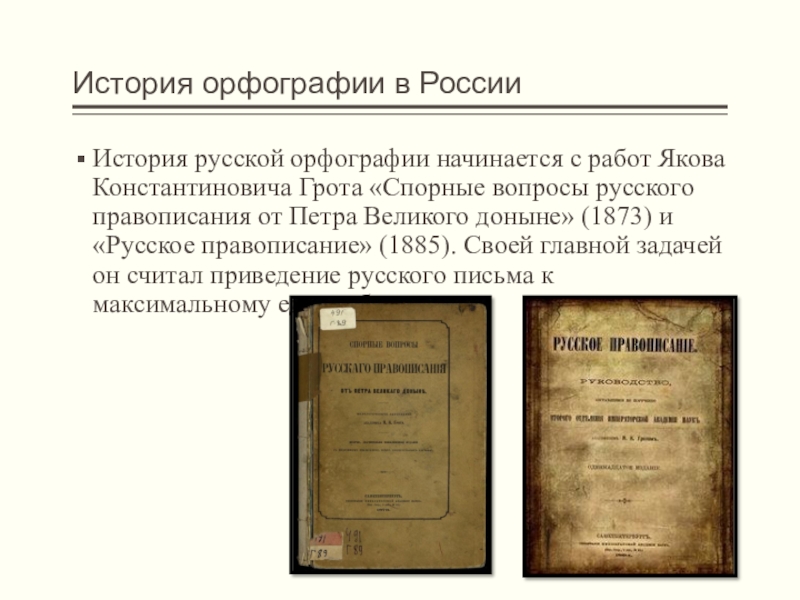Грота «Спорные вопросы русского правописания от Петра Великого доныне» (1873) и «Русское правописание» (1885). Своей главной задачей он считал приведение русского письма к максимальному единообразию.