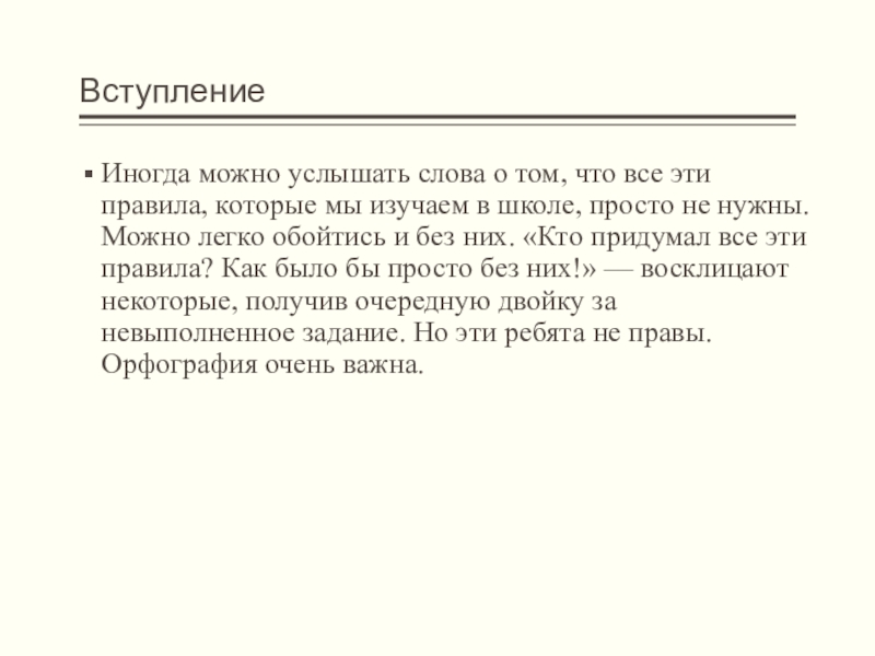 которые мы изучаем в школе, просто не нужны. Можно легко обойтись и без них. «Кто придумал все эти правила? Как было бы просто без них!» — восклицают некоторые, получив очередную двойку за невыполненное задание. Но эти ребята не правы. Орфография очень важна.