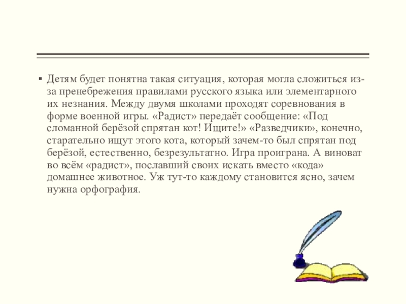 русского языка или элементарного их незнания. Между двумя школами проходят соревнования в форме военной игры. «Радист» передаёт сообщение: «Под сломанной берёзой спрятан кот! Ищите!» «Разведчики», конечно, старательно ищут этого кота, который зачем-то был спрятан под берёзой, естественно, безрезультатно. Игра проиграна. А виноват во всём «радист», пославший своих искать вместо «кода» домашнее животное. Уж тут-то каждому становится ясно, зачем нужна орфография.