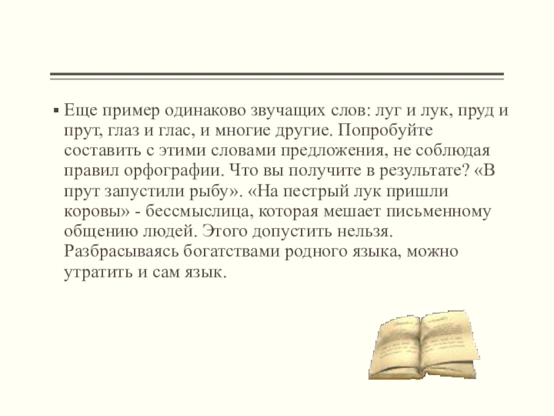 глаз и глас, и многие другие. Попробуйте составить с этими словами предложения, не соблюдая правил орфографии. Что вы получите в результате? «В прут запустили рыбу». «На пестрый лук пришли коровы» - бессмыслица, которая мешает письменному общению людей. Этого допустить нельзя. Разбрасываясь богатствами родного языка, можно утратить и сам язык.