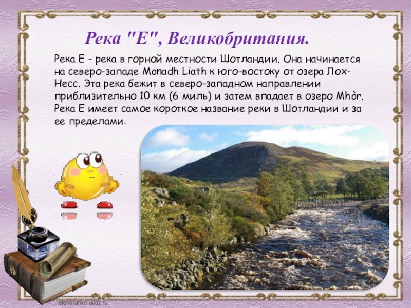 Слайд 12Река E - река в горной местности Шотландии. Она начинается на