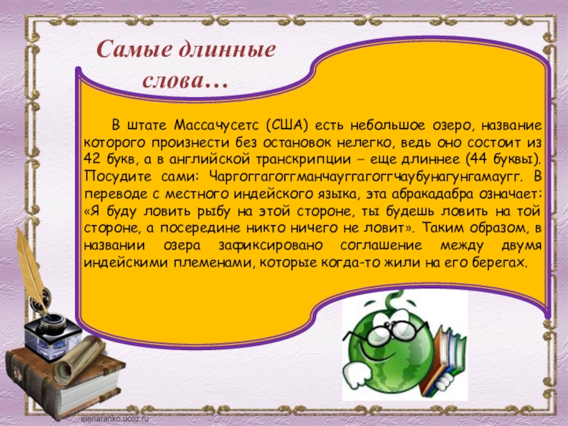 без остановок нелегко, ведь оно состоит из 42 букв, а в английской транскрипции – еще длиннее (44 буквы). Посудите сами: Чаргоггагоггманчауггагоггчаубунагунгамаугг. В переводе с местного индейского языка, эта абракадабра означает: «Я буду ловить рыбу на этой стороне, ты будешь ловить на той стороне, а посередине никто ничего не ловит». Таким образом, в названии озера зафиксировано соглашение между двумя индейскими племенами, которые когда-то жили на его берегах.