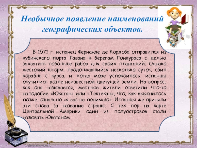 отправился из кубинского порта Гавана к берегам Гондураса с целью захватить побольше рабов для своих плантаций. Однако жестокий шторм, продолжавшийся несколько суток, сбил корабль с курса, и, когда море успокоилось, испанцы очутились возле неизвестной цветущей земли. На вопрос, как она называется, местные жители ответили что-то наподобие «Юкатан» или «Тектекан», что, как выяснилось позже, означало «я вас не понимаю». Испанцы же приняли эти слова за название страны. С тех пор на карте Центральной Америки один из полуостровов стали называть Юкатаном.