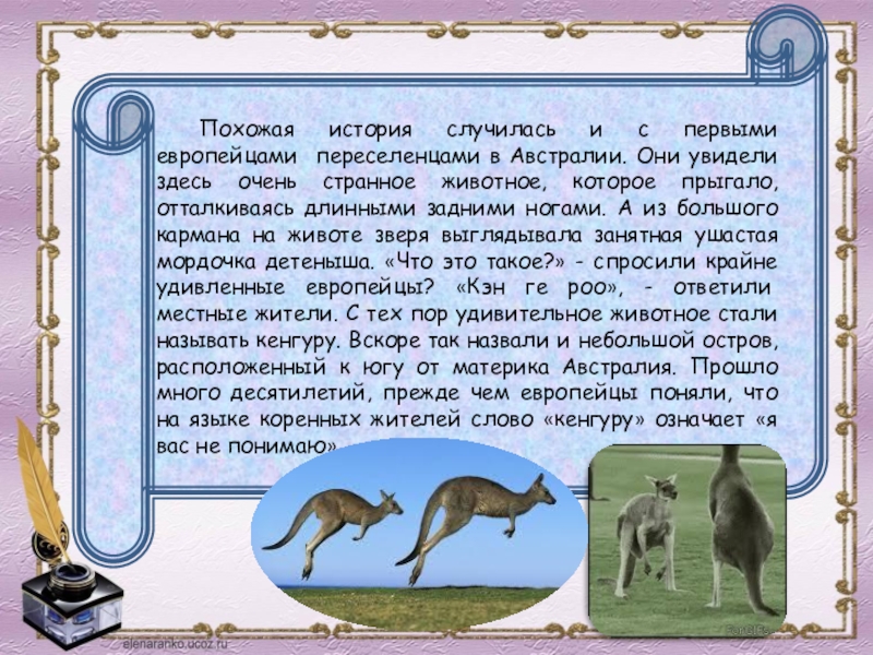 увидели здесь очень странное животное, которое прыгало, отталкиваясь длинными задними ногами. А из большого кармана на животе зверя выглядывала занятная ушастая мордочка детеныша. «Что это такое?» - спросили крайне удивленные европейцы? «Кэн ге роо», - ответили местные жители. С тех пор удивительное животное стали называть кенгуру. Вскоре так назвали и небольшой остров, расположенный к югу от материка Австралия. Прошло много десятилетий, прежде чем европейцы поняли, что на языке коренных жителей слово «кенгуру» означает «я вас не понимаю».