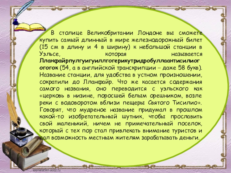 железнодорожный билет (15 см в длину и 4 в ширину) к небольшой станции в Уэльсе, которая называется Лланфайрпулгуигуиллгогерикутридробуллаантисилиогогогок (54, а в английской транскрипции – даже 58 букв). Название станции, для удобства в устном произношении, сократили до Лланфайр. Что же касается содержания самого названия, оно переводится с уэльского как «церковь в низине, поросшей белым орешником, возле реки с водоворотом вблизи пещеры Святого Тисилио». Говорят, что мудреное название придумал в прошлом какой-то изобретательный шутник, чтобы прославить свой маленький, ничем не примечательный поселок, который с тех пор стал привлекать внимание туристов и дал возможность местным жителям зарабатывать деньги.