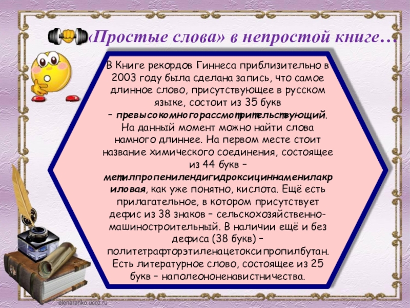 сделана запись, что самое длинное слово, присутствующее в русском языке, состоит из 35 букв – превысокомногорассмотрительствующий. На данный момент можно найти слова намного длиннее. На первом месте стоит название химического соединения, состоящее из 44 букв –метилпропенилендигидроксициннаменилакриловая, как уже понятно, кислота. Ещё есть прилагательное, в котором присутствует дефис из 38 знаков – сельскохозяйственно-машиностроительный. В наличии ещё и без дефиса (38 букв) –политетрафторэтиленацетоксипропилбутан. Есть литературное слово, состоящее из 25 букв – наполеононенавистничества.