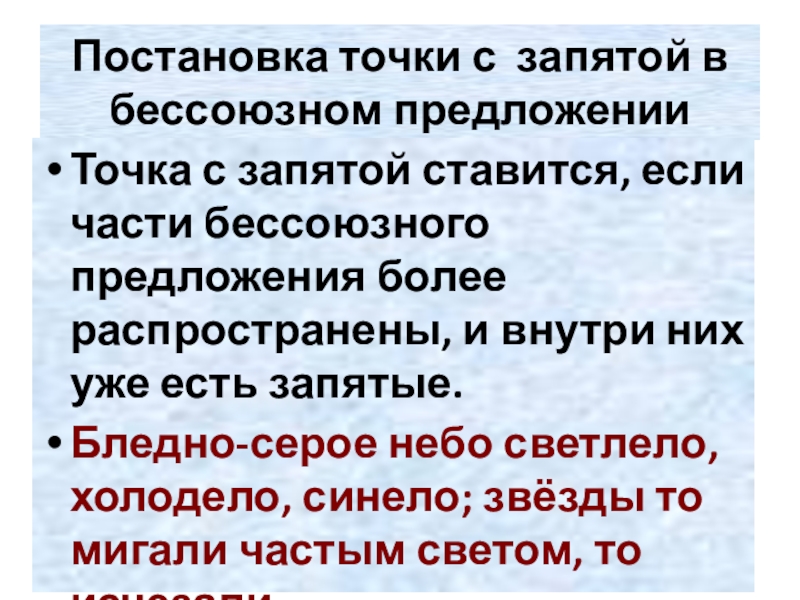 Слайд 4Постановка точки с запятой в бессоюзном предложении