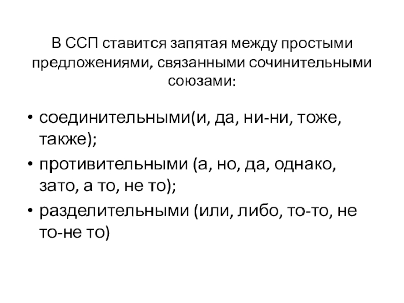 В ССП ставится запятая между простыми предложениями, связанными сочинительными союзами:соединительными(и, да, ни-ни, тоже, также);противительными (а, но, да, однако, зато, а то, не то);разделительными (или, либо, то-то, не то-не то)