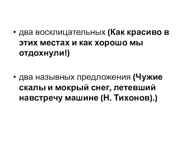 два назывных предложения (Чужие скалы и мокрый снег, летевший навстречу машине (Н. Тихонов).)