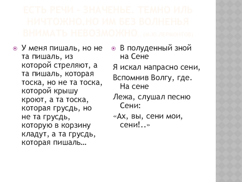 У меня пишаль, но не та пишаль, из которой стреляют, а та пишаль, которая тоска, но не та тоска, которой крышу кроют, а та тоска, которая грусдь, но не та грусдь, которую в корзину кладут, а та грусдь, которая пишаль…