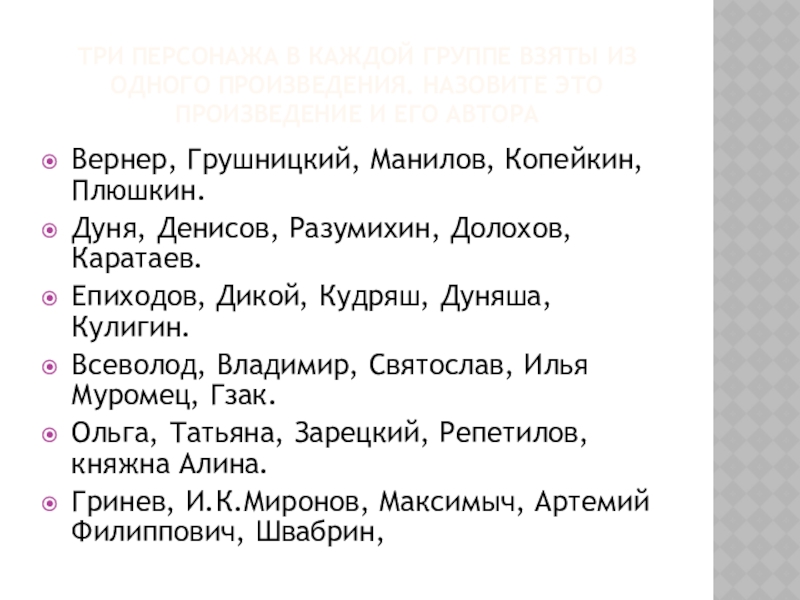 Вернер, Грушницкий, Манилов, Копейкин, Плюшкин.
